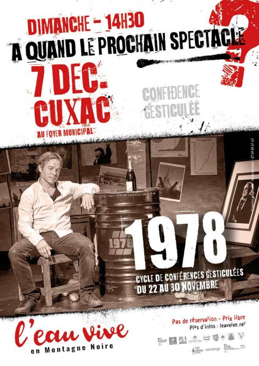 Oui, c’est vrai, en première page, tout ce gloubi-boulga est bien sibyllin, voire gnostique. Mais en lisant attentivement les pages intérieures, c’est un menu pour toute l’année que nous vous invitons à découvrir, à déguster, à abuser, jusqu’à vous en repaître ! Parce qu’à l’Eau Vive, on est comme ça : des hédonistes qui veulent se voir pour ripailler, tous ensemble, dans la joie de moments partagés autour d’un verre, d’un buffet, notre chair traversée des émotions que les plus brillants artistes de notre temps nous feront l’honneur de nous donner. A vot’ santé !